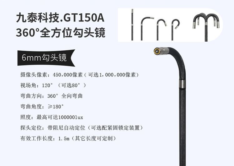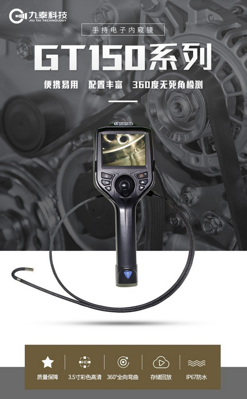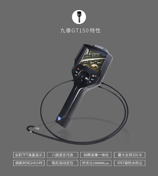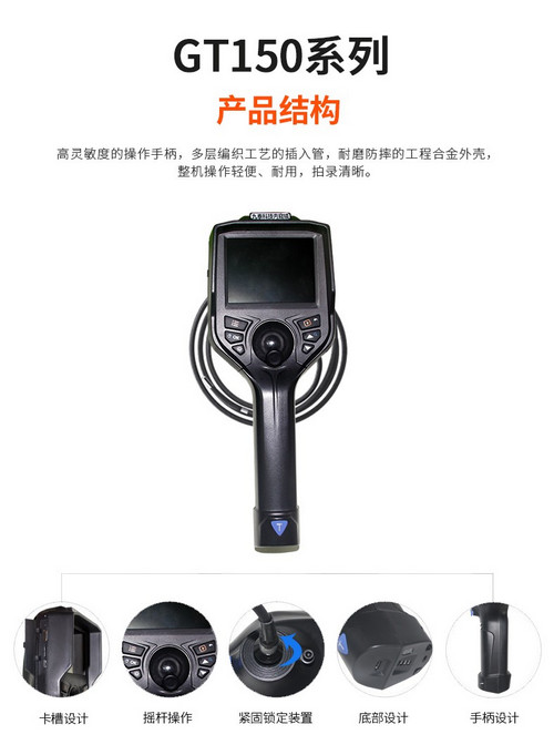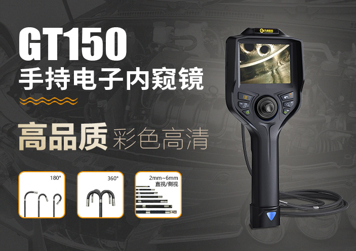 GT150系列手持汽車內窺鏡是一款可無限擴展、兼容性超強的智能高清視頻內窺鏡。采用全彩TFT液晶顯示屏,高清圖像傳感器,遠距離圖傳技術,高靈敏度的操作手柄,多層編織工藝的插入管,耐磨防摔的工程合金外殼,整機操作輕便、耐用,拍錄清晰。HD高清實時拍錄,獨特的雙組電池續航設計,續航提升一倍,同時支持電池自主更換。可選2mm-8mm不同直徑探頭,可靠穩定、成像效果好!主要用于檢查4~200mm直徑的工業管路或復雜狹小的設備內部空間,對腐蝕、裂紋、焊縫、異物、磨損以及零部件內部的加工等情況井行細致全面的檢測。
